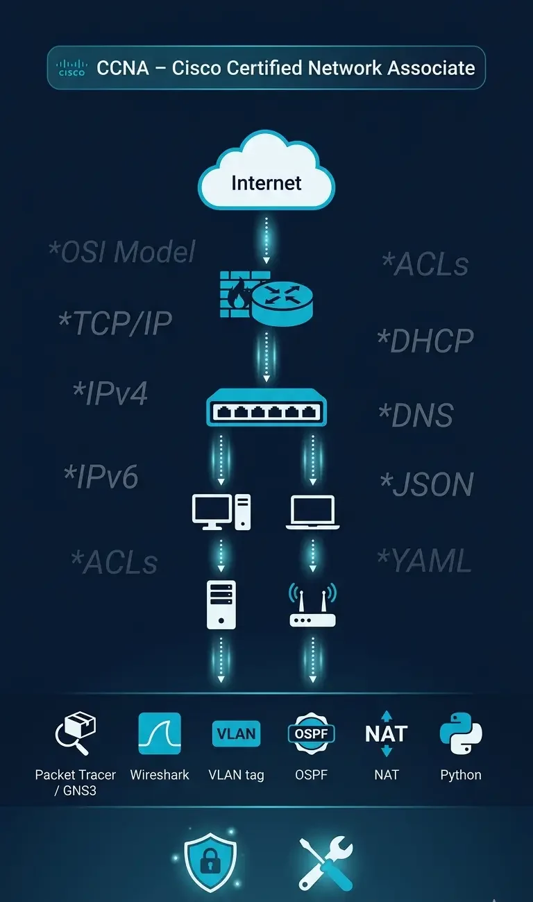 CCNA (Cisco Certified Network Associate) is a globally recognised entry‑to‑mid level networking certification that validates your ability to install, configure, operate, and troubleshoot small to medium‑sized networks. In simple terms, it shows you can: